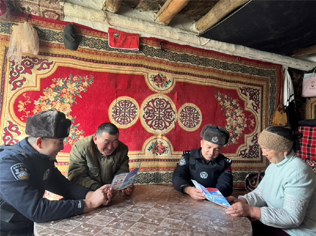 开展暖心服务的同时,民警不忘主责主业。针对牧区信息相对闭塞的情况,将普法宣传融入每个环节。利用牧民休息间隙,通过发放宣传单、以案释法,开展“流动法治课”。用通俗易懂的民族语言,讲解《中华人民共和国出境入境管理法》《中华人民共和国治安管理处罚法》及防范电诈、草原防火等法律法规,提醒大家在忙碌季节守好“钱袋子”,鼓励牧民担任“边境信息员”,共同维护边境安全稳定。
