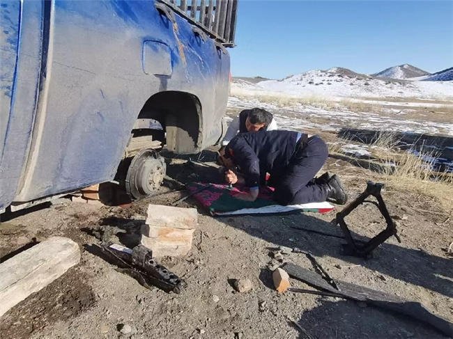 时值牧区转场关键节点,牧民生产生活是民警最放心不下的事。走访至一处草料中转点时,恰遇牧民阿某正对着皮卡车一筹莫展——车子一只轮胎在拉运草料途中爆胎。“别着急,我们带了工具!”民警立即取出千斤顶和扳手,熟练支车、拆卸、更换。仅十几分钟,备胎便更换完毕。看着民警沾满油污的双手,阿某紧握民警的手:“在这荒郊野岭,要不是遇见你们,我真不知要耽误多久,太感谢了!”
