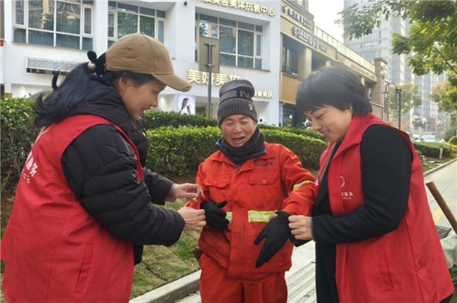 志愿服务队成员为环卫工人送上手套。潘梓健摄