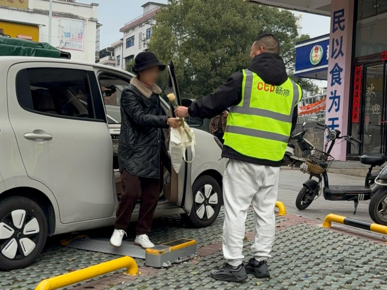 三八妇女节当天,CTP畅停的道路停车巡检员面带微笑,给女性车主送上一支鲜花、道一声节日快乐。