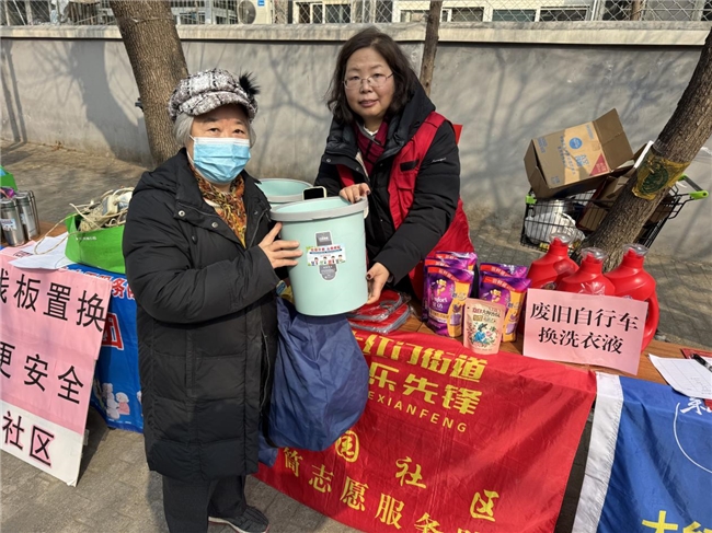 集市现场,铛铛一下旧物换购摊位前热闹非凡,居民们纷纷将家中的旧衣物、书籍等拿来兑换,本次活动累计回收旧物500公斤。此外,社区还继续推出废旧自行车换购洗衣液活动,现场共回收废旧自行车3辆,有效推动解决小区车棚“僵尸车”停放问题;网红“王铁磨”的磨刀摊位前,师傅熟练地为居民打磨刀具,精湛手艺令居民连连称赞;更有社区志愿者加入义务理发点,为辖区居民解决“头等大事”。鑫福里卫生服务中心和刘家窑中医院的义诊台前,医护人员为居民量血压、测血糖,提供健康咨询;月盛斋肉食摊位则带来了特色熟食,让居民在家门口就能品尝到老字号的美味。