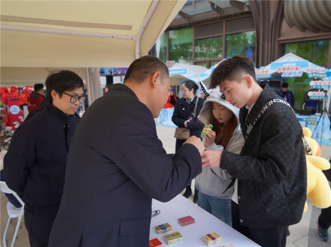 "你好,能教教我们怎么分辨真假烟吗?"两个二十出头的年轻人挤到展台前,其中一个小伙子从兜里掏出一包香烟,"我经常买这款香烟,想学一下这款香烟的鉴别技巧!"