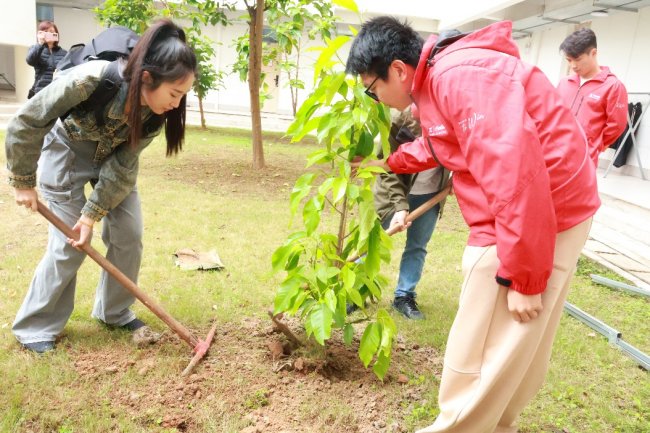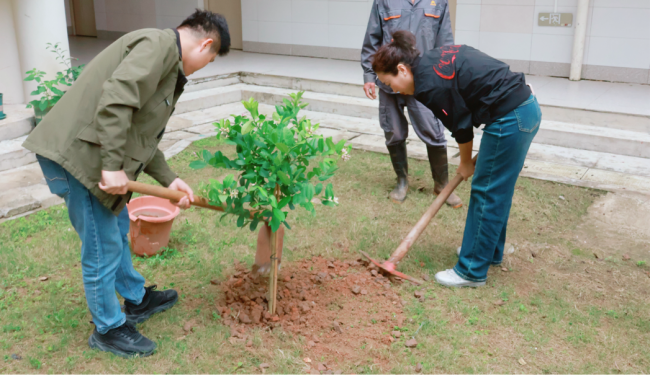 活动现场,双方人员热情高涨、分工协作。在专业技术人员的全程指导下,严格按照种植规范完成树坑修整、苗木扶正、培土压实、浇足定根水等每一道工序,操作严谨、配合有序。校企双方共同种植包括柠檬树、幸福树等8种树木共120株。每一个环节都井然有序,现场一派热火朝天的劳动景象。志愿者表示,植树不仅是为大地添绿,更是一次深刻的生态教育。