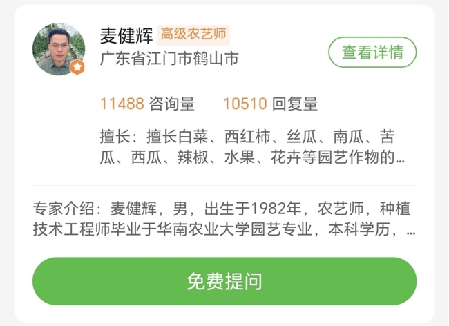 他坚守在线问答一线,累计回复农友咨询1.05万余条。即便相同的问题被反复询问,他依旧耐心细致、有问必答。为让农友随时随地能学技、用技,麦健辉还了录制《苦瓜常见病虫害防治》《辣椒田间肥水管理》等一系列干货视频,言简意赅、实操性强。