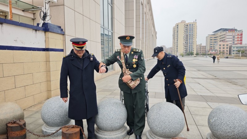 两人走近一看,这名男士穿着一身笔挺的军装,胸前挂着三枚军功章。他的双眼炯炯有神,上身挺得笔直,左腿却站不太稳。他点头示意,潘斌兵接过了行李箱,张明扶周军坐上了轮椅。
