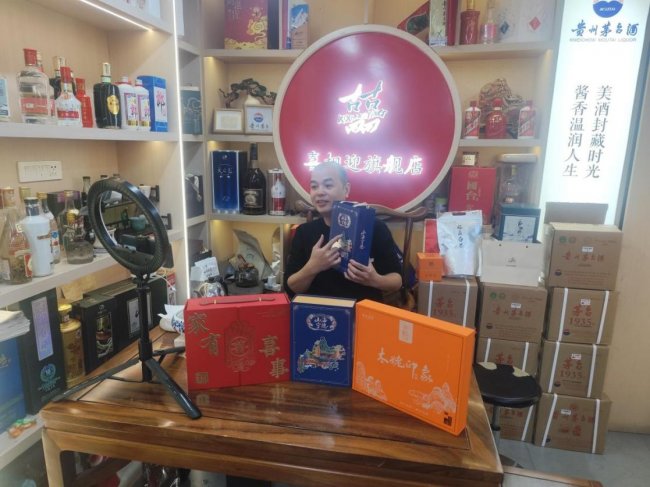 2026年3月,福鼎市太姥山曾忠印烟酒商行店主王群群通过直播分享“一店一特色”“一店一故事”。何晶晶摄。