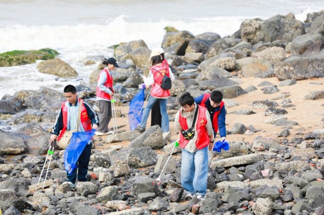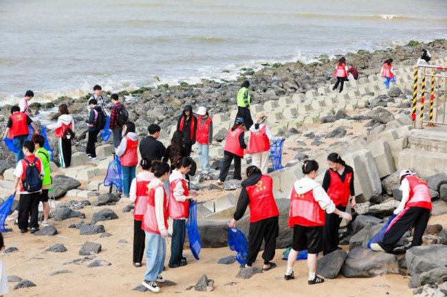 理论知识武装完毕后,“净滩行动”正式拉开帷幕。在工作人员与志愿者的有序组织下,同学们分组领取工具,奔赴指定海滩区域。将散落在沙滩、岩石缝和绿化带中的塑料制品、纸张、玻璃碎片等各类垃圾一一拾起,装入环保垃圾袋。阳光下,忙碌的身影构成了一道动人的公益风景线,经过约一小时的共同努力,环保志愿者和同学们的“战果颇丰”, 清理出数十袋海滩垃圾。