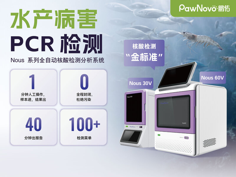 作为菲鹏生物旗下专业动物诊断品牌,鹏佑生物始终坚持以技术创新驱动行业发展。Nous系列全自动核酸检测分析系统凭借便捷、快速、精准的特点,正推动病害检测能力从实验室向养殖一线延伸,为水产养殖业提供更加科学、高效的防控工具。