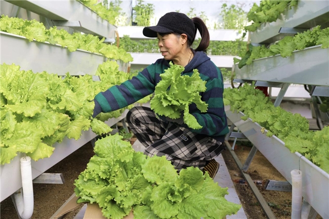“以前我家这大棚就守着种黄瓜,平地种、一季收,空间浪费多不说,市场行情不好的时候,忙活一年也挣不了几个钱。工作队来了之后,不光给咱农场起了‘云梦’这么好听的名字,还帮咱改棚架、建‘空中农场’,蔬菜都长在架子上,能种生菜、茼蒿好几个品种,收成直接翻了好几番,这棚子算是真正活起来了!”李秀云一边整理捆扎刚采摘的鲜菜,一边笑着说道,眉眼间满是欢喜。