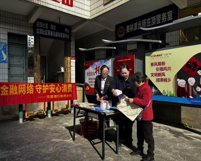 线下,华夏银行福州福清支行联合公安走进福建万达集团,为企业员工剖析“职业背债”陷阱;华夏银行泉州晋江支行走进许厝农贸市场,在水果摊边、菜摊前向商户和居民讲解“高收益理财”诈骗手法;华夏银行泉州南安支行深入美林街道庄顶村,用乡音土话为老年群体拆解“养老投资”套路……