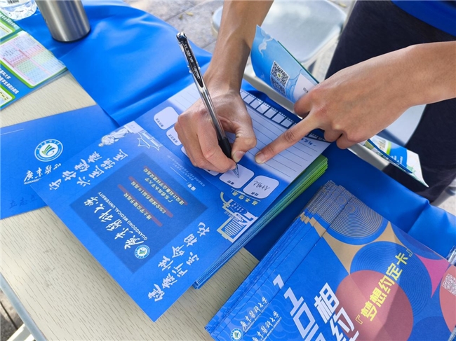 活动当天,志愿者们早早来到了宣讲点。胸前统一佩戴的工作牌不仅是身份的象征,更是责任的重量。随着广东医科大学旗帜在校园中飘扬,志愿者们忙碌地布置起宣讲台,精美的招生传单与各类广东医专属文创错落有致地摆放,等待着第一批客人的到来。