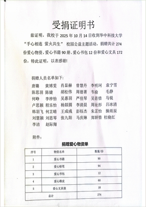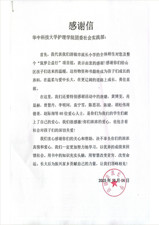 活动结束后,清镇市流长小学特意寄来感谢信与受捐证明。证明中提到,本次活动共捐赠爱心书籍 90 册、爱心铅笔94份、爱心书包12份等总计274份爱心物资,惠及全校学生。此次“手心相连、萤火共生”公益活动,不仅是一次物资的传递,更是一次心灵的联结。当满载爱心的物资抵达清镇市流长小学时,孩子们脸上洋溢的笑容成为最珍贵的画面。这些书籍和用品不仅解决了孩子们的学习需求,更重要的是让他们感受到了社会的关爱,这份温暖会成为他们努力学习的动力。