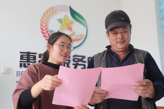 图为工作人员向农户解读作物收购政策