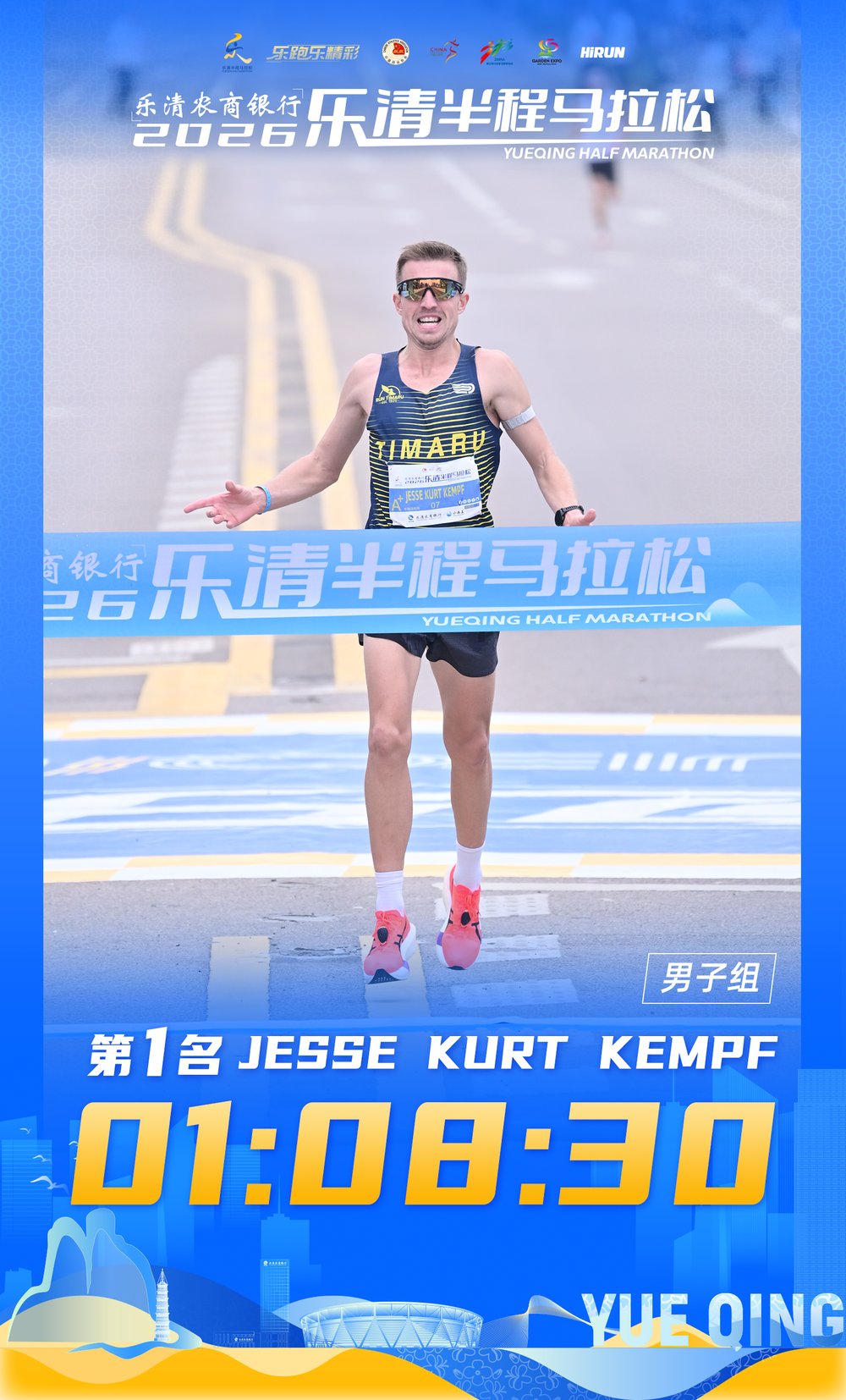 选手JESSE KURT KEMPF以01:08:30的成绩获得半程马拉松男子组第一名。选手戴号东、陆朝晓分别以01:08:49、01:10:43的成绩获得半程马拉松男子组第二、第三名。