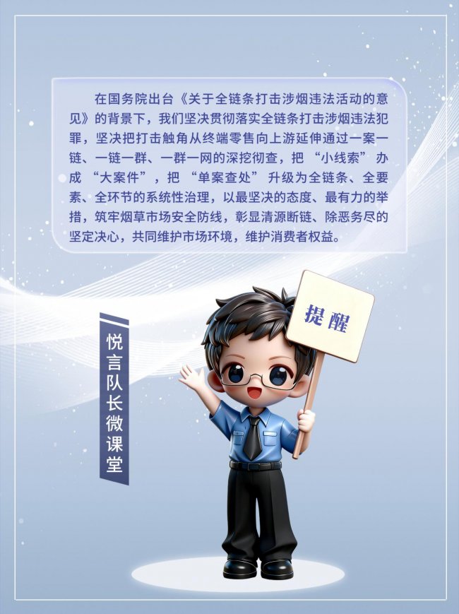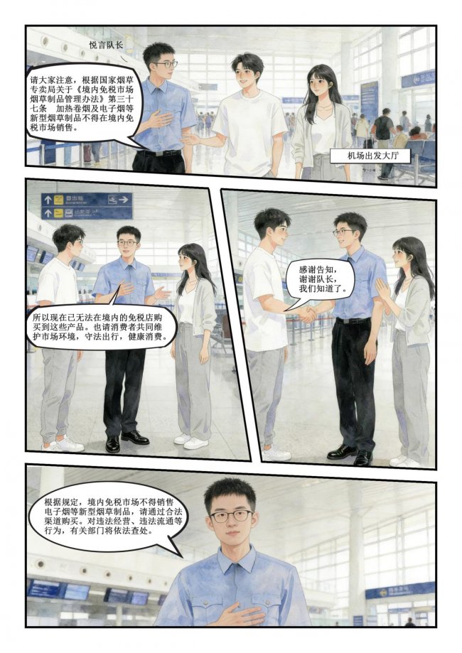 机场出发大厅,悦言队长向小林和小美普法:根据规定,境内免税市场不得销售电子烟等新型烟草制品,请通过合法渠道购买。对违法经营、违法流通等行为,有关部门将依法查处。