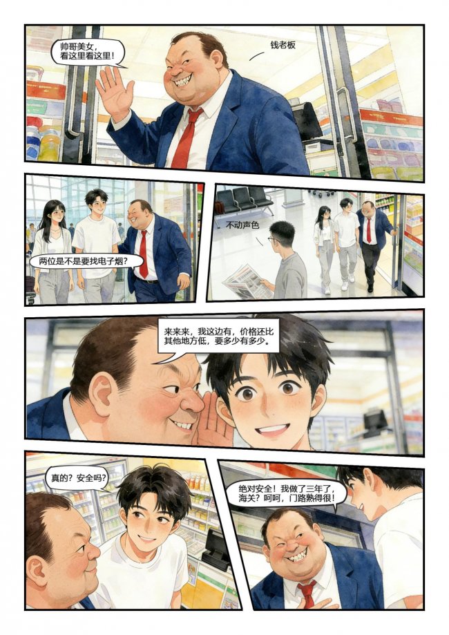 机场免税店内,钱老板主动搭住寻找电子烟的小林,吹嘘自家货源不限量、价格更低,还炫耀自己门路熟、能规避监管。看似“划算”的交易背后,违法交易已悄然展开。