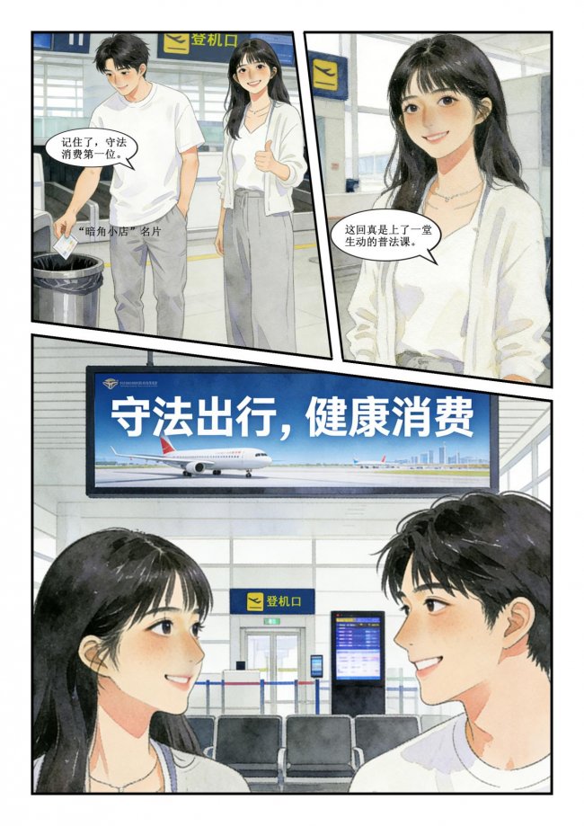 登机口前,小林将“暗角小店”的名片扔进垃圾桶,小美为这次普法课点赞。此刻,“守法出行,健康消费”的公益广告在身后格外醒目——这一次,他们带走的,不仅是旅途的美好记忆,更是对法律的敬畏、对守法消费的坚定信念。