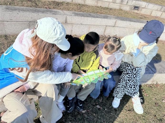 图为:阳光学院人工智能学院志愿者为儿童讲解闽江禁渔科普知识。