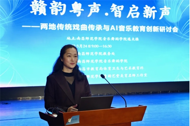 活动伊始,南昌师范学院音乐舞蹈学院院长张旦丹在致辞中指出,本次赣粤携手,是回应人工智能浪潮与坚定文化自信的时代之举。她强调,美育的核心在于立德树人,技术的使命应是“赋能”而非“炫技”。AI与音乐教育的融合,要精准聚焦教学中的真实痛点,将抽象的艺术感知转化为可感、可练、可创的生动体验,提升课堂的效能与感染力。同时,对于戏曲等传统文化的校园传承,必须借助创造性转化与创新性发展,运用现代科技手段让古老艺术焕发新生,真正走进并滋养青少年的精神世界。她期待本次活动能成为一个高效务实的交流平台,促成理念、资源与智慧的深度碰撞,共同探索出一条技术为翼、文化为魂的美育高质量发展新路径。