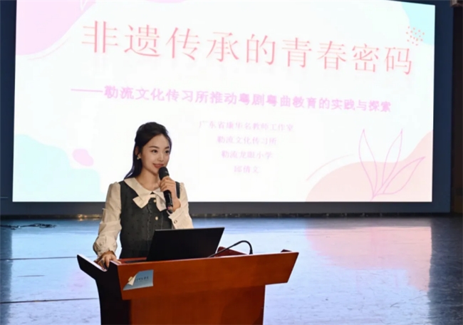 下午的议程深入探讨了传统戏曲,特别是粤剧在中小学校的活态传承策略与实践。顺德区勒流文化传习所负责人邱倩文以“非遗传承的青春密码”为题,系统介绍了传习所构建的“传习所+学校+社区+社团”四位一体传承体系。通过引进名家工作室系统培养师资、开展大规模体验活动、积极探索数字化教学,并组织学生参与从市级比赛到德甲联赛开球式等高规格展演,让粤剧在青少年中真正“活”了起来,覆盖与获奖数量显著提升。