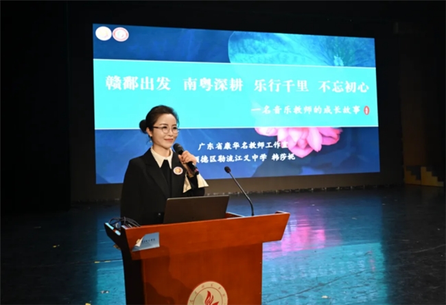在教师成长与美育实践板块,顺德区勒流江义初级中学韩莎妮老师以《赣鄱出发 南粤深耕 乐行千里 不忘初心》为题,深情讲述了自己从江西走向广东顺德,在美育道路上坚守初心的历程。分享了从一名普通教师成长为省级粤派名教师工作坊主持人的经历。带领西藏班学生从害羞胆怯到站上市级特等奖舞台自信绽放的感人故事,诠释了“以美育人、润物无声”的教育情怀。
