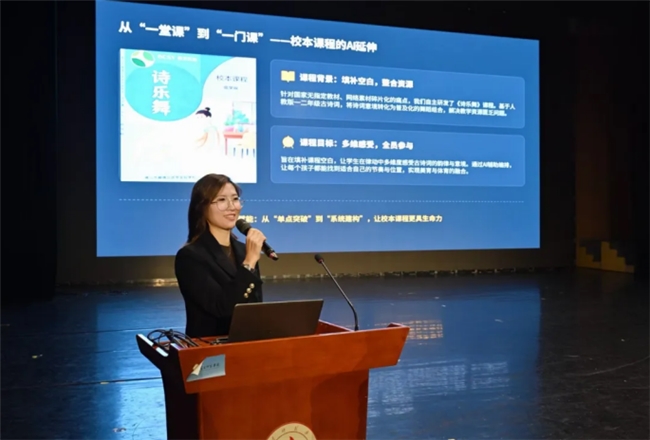 上午的研讨聚焦人工智能如何深度赋能音乐学科教学。来自佛山市顺德区拔萃实验学校的田琳琳老师,以《AI赋能音乐美育 智慧重构美育课程》为题,结合《白桦林好地方》等具体课例,生动展示了AR沉浸场景、AI数字人对话、实时数据分析等技术在情境创设、文化理解和技能训练中的落地应用。她强调,AI的核心价值在于解决“课堂真实痛点”,其最终指向是育人本质。田老师还介绍了依托AI技术开发的《诗乐舞》与单元音乐剧校本课程,实现了从“单课融合”到“课程建构”的美育闭环,为一线教师提供了清晰、可复制的实践方向。