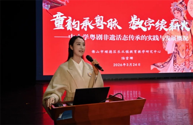 顺德区乐从镇教育教学研究中心美育专干陆雪珊从全镇战略层面系统分享了乐从镇推动粤剧非遗高质量发展的路径。通过构建“73校共育”美育新生态,以《顺德乡土音乐教材》筑牢文化根基,并创新运用AR、AI技术活化传统教学,推动粤剧与广绣、舞蹈等多艺术门类融合,构建了“课程—教材—活动”一体化的系统传承模式。