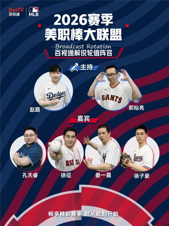 由主持人赵路、郭灿亮,明星嘉宾娄一晨、徐征、孔天睿、徐子豪等组成的金牌解说团队,将再次集结出发,以全新的解说视角、专业的赛事分析、与 AI 科技加持的转播体验,为球迷带来专业与趣味兼具的观赛感受。另外,由团队全新打造的专业虚拟演播室将正式启用,打造多场景交互式观赛空间,将科技感与沉浸感融入观赛全程,让球迷仿佛置身赛场核心。未来,百视通还将不断提升使用场景,配置 XR 拓展现实专区,实现大联盟赛事数据可视化呈现等功能,让赛场风云一目了然,解锁专业观赛新体验。
