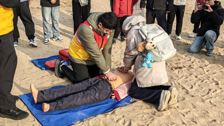 沙滩一角,持有红十字救护员证书的志愿者李耀正蹲在假人道具旁,向往来游客演示讲解心肺复苏操动作要领:“手臂要垂直,按压深5-6厘米,频率每分钟100-120次……”不时邀请游客进行按压练习并手把手指导。人群中,志愿者王大钊、高嘉怡向围观游客讲解急救要点、介绍动作要领。在志愿者们的带动下,越来越多的游客纷纷卷起袖子,在指导下上前体验。