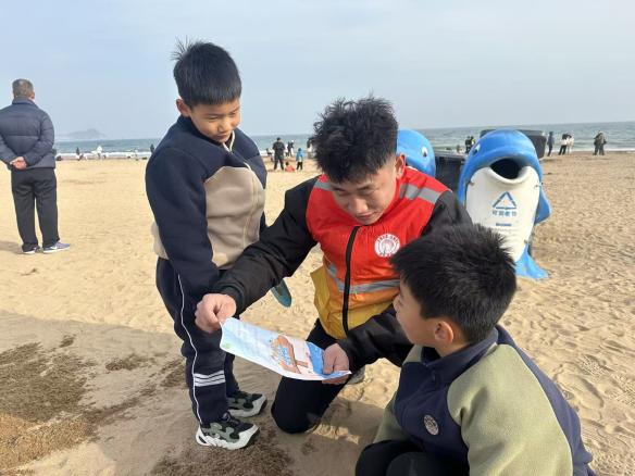 志愿者周培昭蹲下身,耐心向一位带孩子游玩的游客讲解安全知识。午后的海边,人流渐增,志愿者们手持宣传单,将一份份涵盖居家用电、交通安全、海边游玩等知识的宣传页送到大家手中。一句句贴心的叮嘱,一次次耐心的讲解,让这份特殊的“安全礼包”带着温度,悄然入心。