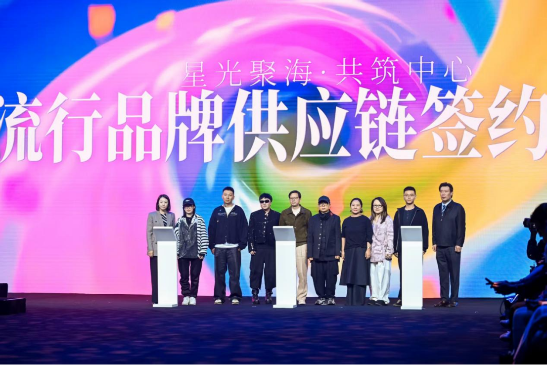 紧随其后,为夯实产业生态,中国服装协会副会长兼秘书长屈飞,中国服装设计师协会秘书长王莹以及海宁中国皮革城股份有限公司党委书记、董事长黄征共同启动了“星光聚海·共筑中心——流行品牌供应链合作签约”仪式。现场,金顶奖设计师、WUD品牌总监武学伟,佗寂设计总监、2022年度最佳女装设计师粱云侠,FACEONLAB创意总监、2022年度最佳男装设计师黄光辰,2021年度年度新锐配饰设计师 、瓒兒ZANER艺术珠宝创始人倪瓒儿,第15届10+3 SHOWROOM入选设计师、壹亍A.1设计总监许家煜,思沃福品牌高级设计师史航,Balcony品牌创始人王志昂等一批在国内外享有盛誉的潮牌主理人、独立设计师及新生代设计力量,见证仪式。这一举措不仅是海宁时尚产业生态布局的关键落子,更是通过链接优质品牌与设计资源,以品牌聚力推动“潮启新程”的产业发展目标。会后,设计师代表在发言中表示,海宁日益完善的产业链条与开放包容的产业环境,为设计师提供了从创意到商业转化的理想土壤,未来将与海宁携手,共同探索中国设计的无限可能。