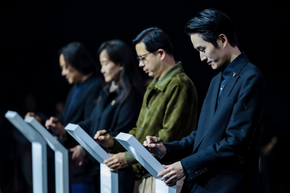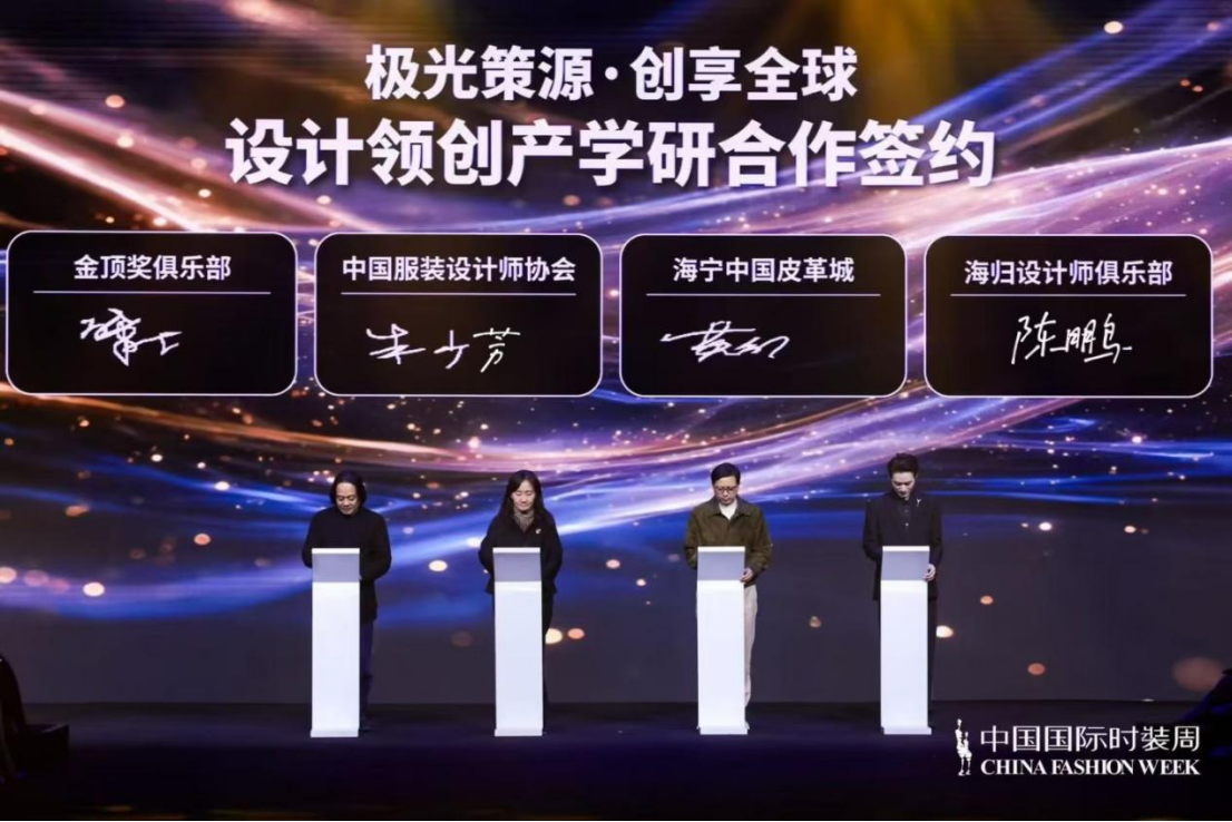 签约现场,中国服装设计师协会专职副主席朱少芳,海宁中国皮革城股份有限公司党委书记、董事长黄征,中国服装设计师协会金顶奖俱乐部负责人张肇达,中国服装设计师协会海归设计师俱乐部负责人陈鹏共同签署合作协议,这标志着中国时尚产业在人才培养与引进机制上迈出了实质性一步,将为行业高质量发展注入源源不断的创新动能。