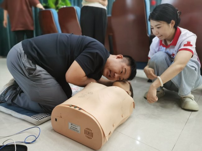 培训课上,心肺复苏要上手练,AED操作要反复模拟。按压深度5到6厘米,频率每分钟100到120次——这些枯燥的数字,每人至少练了几十遍,直到形成肌肉记忆。