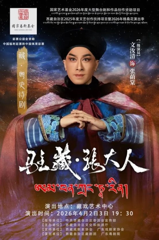 由西藏自治区藏剧团与广东粤剧院首度联袂打造的原创大型剧目藏·粤史诗剧《驻藏·张大人》4月2日、3日 19:30即将在西藏自治区藏剧团藏戏艺术中心上演。该剧是中共西藏自治区委员会宣传部与西藏自治区文化和旅游厅重点部署的文化创作项目,也是藏戏与粤剧两个联合国非遗剧种的首次深度融合之作。