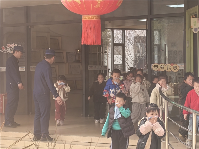 随着急促的警报声响起,应急疏散演练启动。在消防员和老师引导下,师生捂住口鼻、弯腰低姿,沿预定路线快速有序撤离至安全区域,整个过程高效规范,检验了校园应急预案的可行性,提升了协同避险能力。