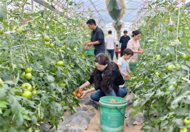 (图为游客在蔬菜大棚采摘西红柿)