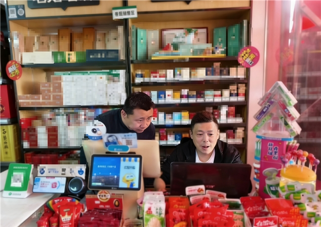 (图为客户经理胡鹏在温馨超市中指导经营)