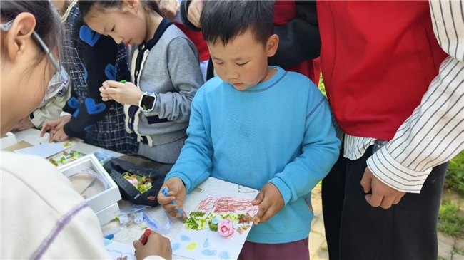 随后,相框作画更是将活动氛围推向高潮,孩子们在志愿者的指导下,巧用自然掉落的油菜花,搭配蜡笔、纸胶带等工具,在相框上尽情发挥想象力,勾勒春日轮廓、粘贴花田色彩,将对春天的美好想象融入一件件创意作品中,每一幅画作都充满童真童趣。