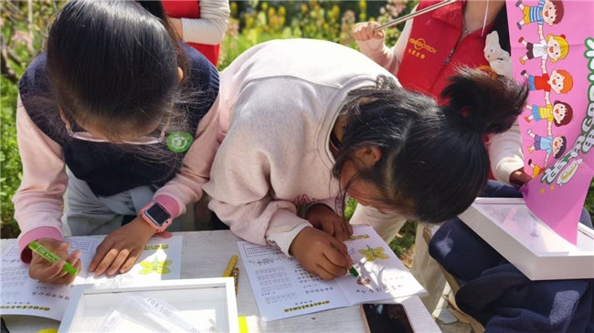 在实践环节,孩子们手持专属油菜花探索手册,在志愿者的引导下,结合现场观察与科普知识,认真填写手册中的观察日记、知识问答、春日诗句等内容,将所学所感落笔成字,让科普知识真正入脑入心。