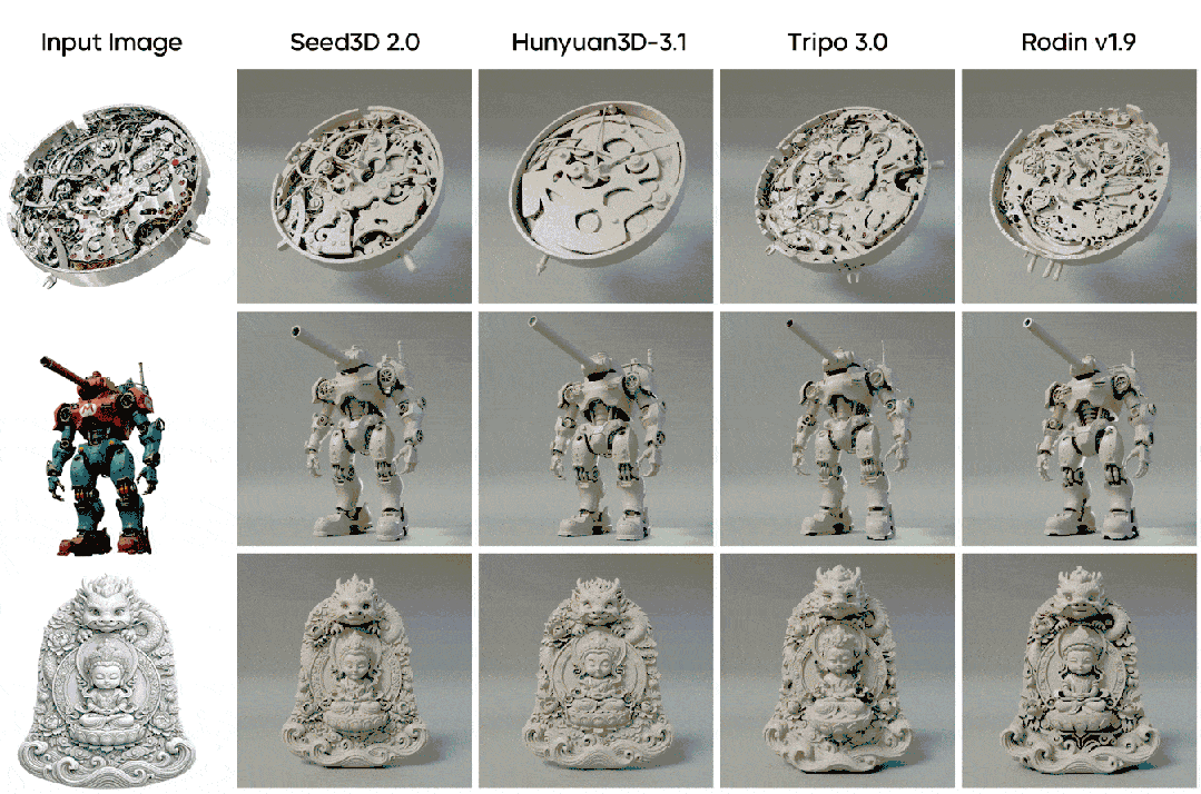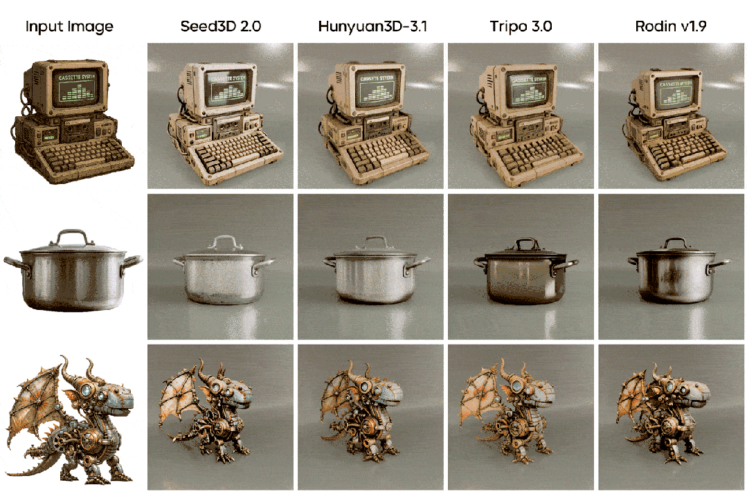 围绕几何精度和纹理材质,Seed3D 2.0进行了架构升级,并拓展了3D 内容的下游可用性,进一步推动3D 生成迈向“生产可用”。用户输入一张图,即可生成结构更准确、材质更真实的3D 资产。