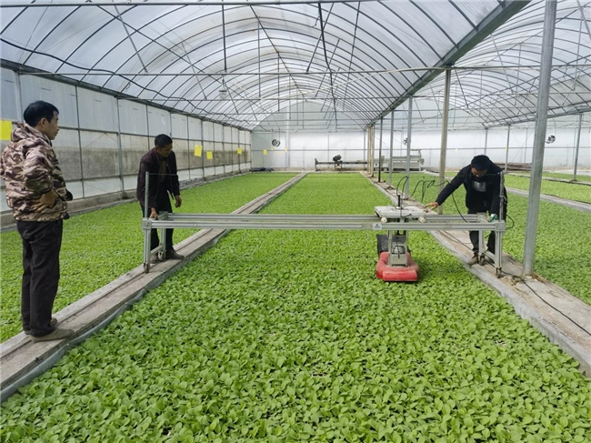 眼下,随着间苗定苗工作的圆满完成,烟叶育苗工作顺利转入剪叶管护阶段,这是培育壮苗、促进烟苗盘根、为大田移栽做好准备的关键一步。在相邻的育苗棚里,自动化剪叶设备正沿着轨道匀速移动,为烟苗开展统一剪叶作业。育苗户和技术人员合力调整设备高度与行进速度,确保剪叶深度均匀、不伤烟苗。“比起纯人工剪叶,用机器剪叶又快又整齐,剪出来的烟苗高度一致,还能让烟苗长得更敦实、根系更壮。”正在操作设备的育苗户笑着说,“不光省了不少力气,管护效果也更好,烟苗质量更有保障。”技术人员实时监测设备运行状态,根据烟苗长势灵活调整剪叶参数,全程保障管护效果。