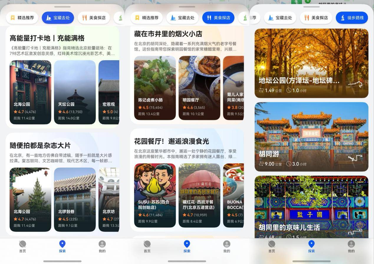 在复刻“名场面”的同时,点击地图首页下方的“探索”按钮,还能清楚看到地图上清楚标记的附近宝藏好去处!先根据“宝藏去处”的出行指南探索周边大小打卡点,让每一次出发都有自己的“理由”;再前往“美食探店”去邂逅不同风味美食,爱好徒步的用户也能在“徒步路线”中找到自己的钟爱。