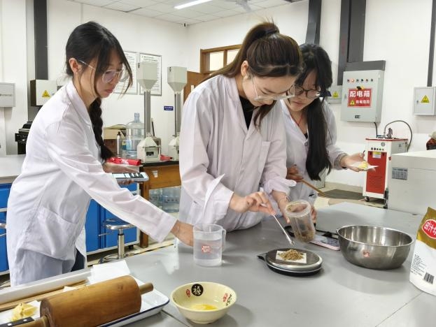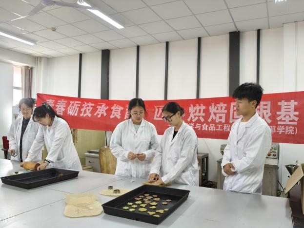 青春砺技承食韵,匠心烘焙固根基。紧扣食品科学与工程专业特色,学院开展黄油饼干制作实践活动。专业教师现场示范教学,从原料配比、黄油打发、面团整形到温度控制,细致讲解背后的食品化学与工艺原理,将课堂理论转化为直观操作。同学们以小组为单位协作实操,在规范流程中精益求精,在配方与造型上大胆创新,既锻炼了动手能力,又培育了工匠精神。此次活动不仅增强了同学们对食品专业的认同感与归属感,更让大家在实践中体会到“食以安为先”的责任与使命。