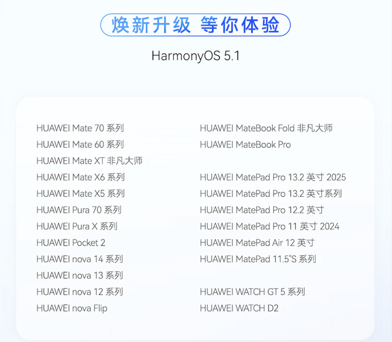 据悉,华为已正式面向用户推送HarmonyOS 5 1版本,此次升级覆盖机型40余款,包含HUAWEI Mate 70、Mate 60、Mate X6、Pura 70、Pu
