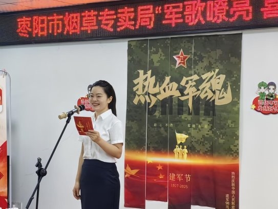 在八一建军节来临之际,枣阳市烟草专卖局(营销部)迎来了“军歌嘹亮 喜迎‘八一’”庆祝活动。现场军歌嘹亮、旗帜飘扬,不仅是对人民