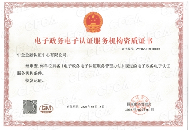 近日,中金金融认证中心(CFCA)通过国家密码管理局资质审查,获颁新版《电子政务电子认证服务机构资质证书》。 《电子政务电子认证