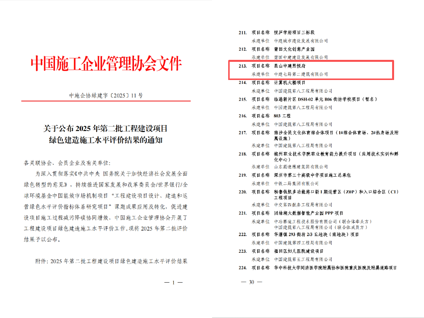 近日,中国施工企业管理协会正式公布了2025年第二批工程建设项目绿色建造施工水平评价结果。中建七局二公司江苏分公司昆山中建·熙悦府