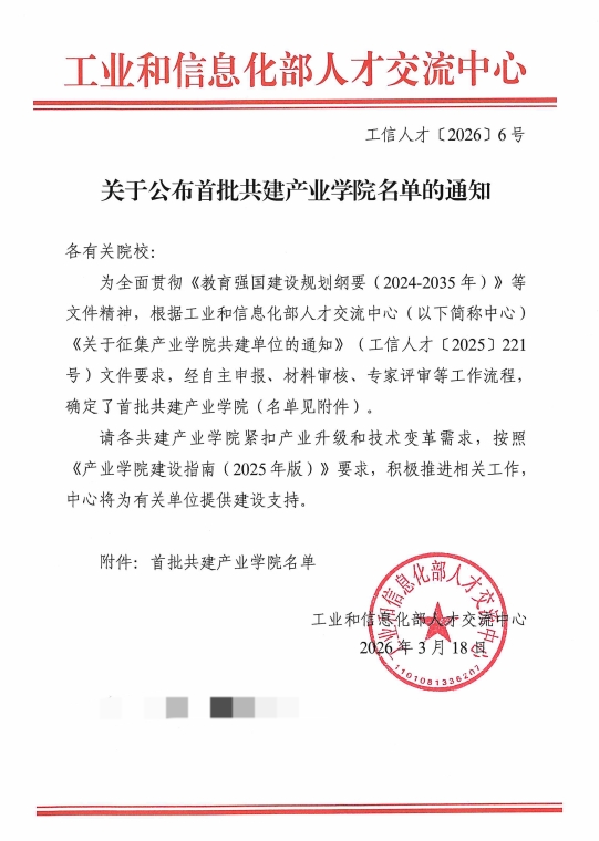 近日,工业和信息化部人才交流中心正式公布《首批共建产业学院名单》(工信人才〔2026〕6号)。经过自主申报、材料审核、专家评审等严格程