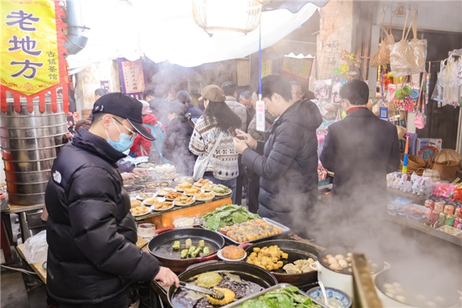 初春的清晨,浙江兰溪市游埠古街早已人声鼎沸。沿街茶馆卸下厚重门板,支起临街摊位,食客摩肩接踵、穿行其间,吆喝声、交谈声与茶具碰