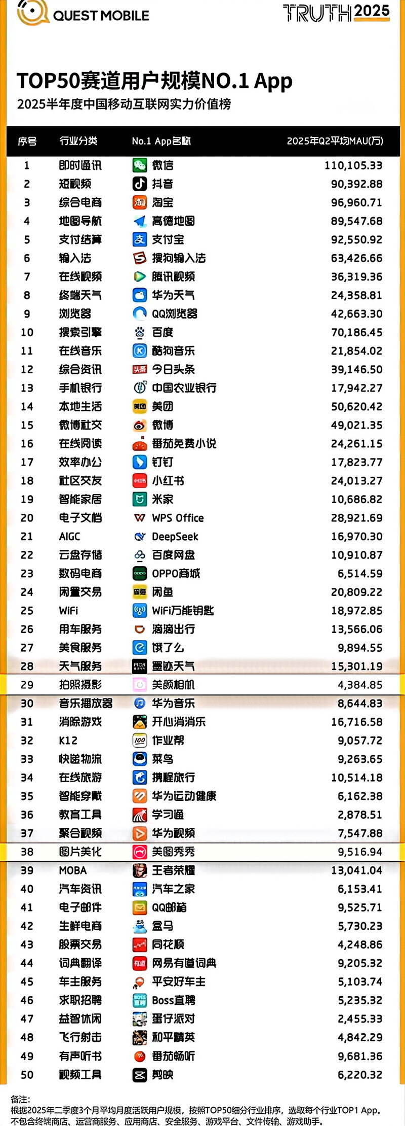 7月29日,QuestMobile发布2025半年度中国移动互联网实力价值榜,美图公司旗下美图秀秀蝉联中国图片美化用户规模第一名,美颜相机蝉联中